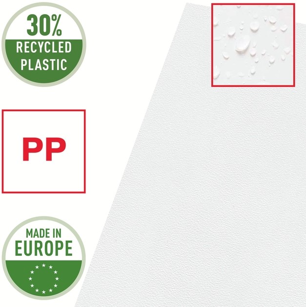 Stevig polypropyleen van 115 micron zorgt ervoor dat de zichtmap keer op keer kan worden hergebruikt.
