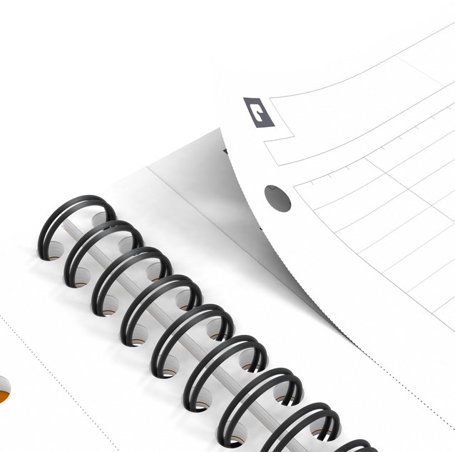 De robuuste zwarte dubbele spiraalbinding zorgt ervoor dat het notebook plat blijft liggen of gemakkelijk dichtgeklapt kan worden voor een maximaal comfort en flexibiliteit.