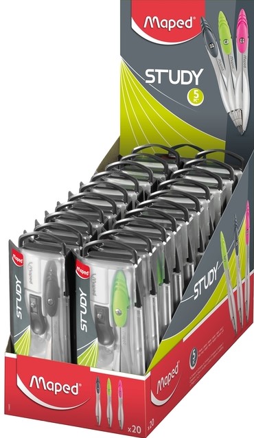 De 5-delige set bestaat uit 1 Study passer, een kokertje met potloodvullingen, een potloodslijper, een schroevendraaier en een stuk gum.