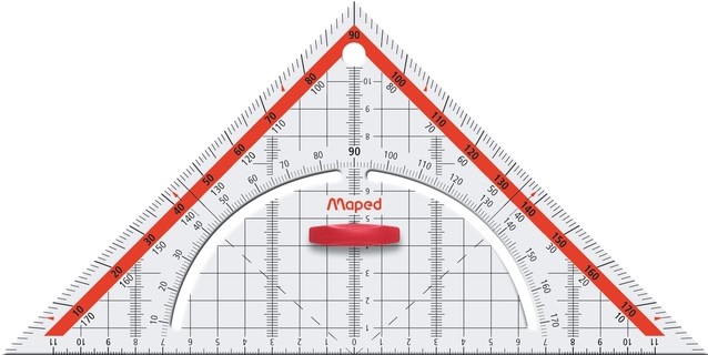 Heeft 4 functies in 1: gekalibreerde driehoek, het tekenen van symmetrische lijnen, het tekenen van parallelle lijnen en het is een gradenboog.