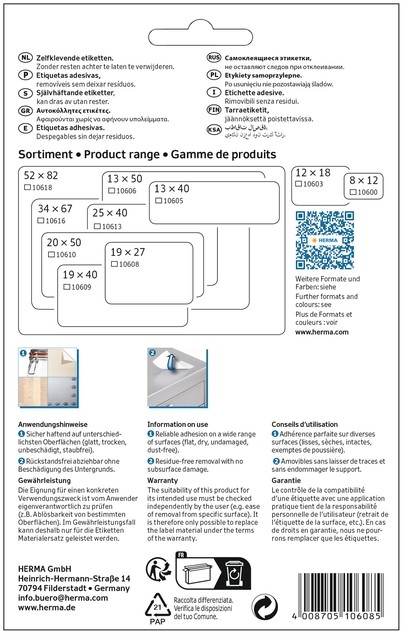 Dankzij de "Free-to-move®"-coating hechten HERMA Movables® betrouwbaar op alle gladde, droge, onbeschadigde en stofvrije oppervlakken, kunnen worden verwijderd zonder de ondergrond te beschadigen, probleemloos te verplaatsen en weer opnieuw te plakken.