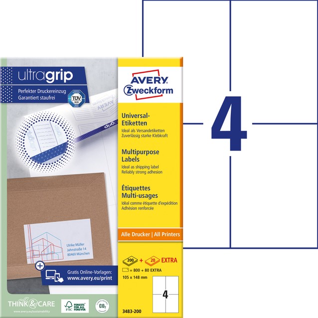 Etiket Avery 3483-200 105x148mm A6 wit 800 stuks