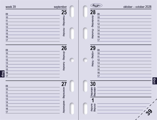 U krijgt 160 pagina's wit papier met blauwe opdruk, met één week per pagina en tijdsindeling van 9:00 uur tot 18:00 uur.