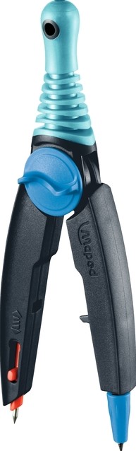 Passer, inzetstuk en vulling in onbreekbaar kunststof doosje.
