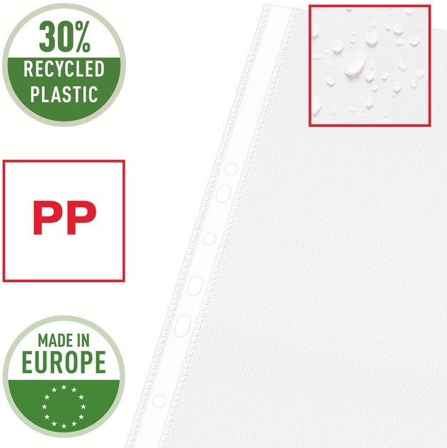 Gestructureerde 0,09 mm PP folie, copy safe. Gemaakt van 30% pre-consumer PP plastic, 100% recyclebaar.