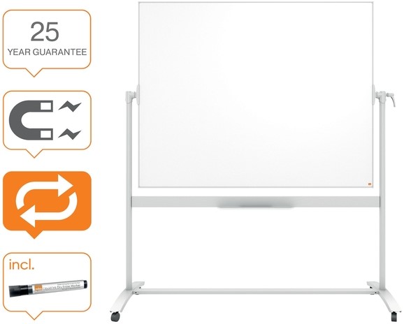 Het dubbelzijdige bord beschikt over een soepel horizontaal draaimechanisme, waardoor het eenvoudig te roteren is in beperkte ruimtes en extra schrijfcapaciteit biedt aan beide zijden.