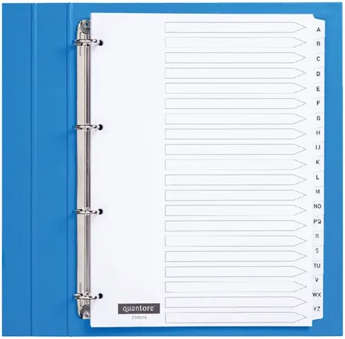 De Quantore tabbladen 4-gaats 20-delig met alfabet wit karton zijn ideaal voor wie zijn documenten alfabetisch wil ordenen met een verzorgde, professionele uitstraling. Gemaakt van stevig wit 170 grams karton bieden deze tabbladen langdurige kwaliteit. De tabs en ponsgaten zijn versterkt met glashelder kunststof, wat extra duurzaamheid garandeert bij veelvuldig gebruik. De tabs zijn aan twee zijden bedrukt met het alfabet, zodat je altijd snel de juiste rubriek vindt. FSC-gecertificeerd en beschikbaar met bedrukte of gekleurde blanco tabs – een milieuvriendelijke én flexibele keuze voor elk archief. Kenmerken: