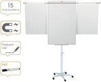De mobiele, magnetisch stalen flipover heeft een modern, onopvallend en smal frame waardoor de ruimte van het bord wordt gemaximaliseerd, met de ruime pennengoot geplaatst onder het bord zonder de schrijfruimte te blokkeren. In hoogte verstelbare mobiele voet met vergrendelbare zwenkwielen om te verplaatsen en vast te zetten. Uitklapbare magnetische armen bovenaan de flipover, die gemakkelijk kunnen worden uitgeschoven om extra pagina's te ltonen. Magnetisch whiteboardoppervlak van staal biedt een verhoogde uitwisbaarheid.