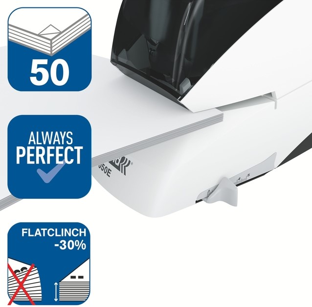 De 5050E nietmachine voor moeiteloos nieten. Gepatenteerde cassette niettechnologie niet 5.000 keer zonder herladen en ongeacht aantal vel papier. Ontworpen voor 500.000 niethandelingen.