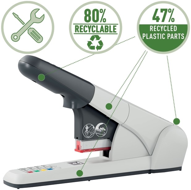 Hoogwaardige Heavy Duty nietmachine met nietcassettesysteem voor het nauwkeurig nieten van 2-80 vellen papier (80 grams). Deze sterke en duurzame nietmachine wordt geleverd met 4 kleurgecodeerde nietcassettes die eenvoudig verwisseld kunnen worden met behulp van het voorlaadmechanisme. Ideaal voor op kantoor, in postkamers en andere gemeenschappelijke ruimtes. Je kunt één nietmachine gebruiken voor documenten van verschillende diktes door de cassette met de gewenste afmeting te selecteren en erin te plaatsen. Deze Heavy Duty nietmachine is gemaakt van metaal en een klein deel gerecyclede post-consumer plastic onderdelen en kan worden gerepareerd met reserveonderdelen om de levensduur van de nietmachine nog verder te verlengen. Aan het einde van zijn levensduur is het 80% recyclebaar wanneer het volledig gedemonteerd is in de verschillende materiaalsoorten om afval te verminderen en de hulpbronnen van de aarde te helpen behouden. De Leitz 5551 Heavy Duty nietmachine heeft een garantie van 10 jaar bij gebruik met Leitz nietjes en is GS-getest op veiligheid. Bijpassende producten zijn verkrijgbaar voor al jouw benodigdheden op het gebied van Heavy Duty nieten en perforeren.