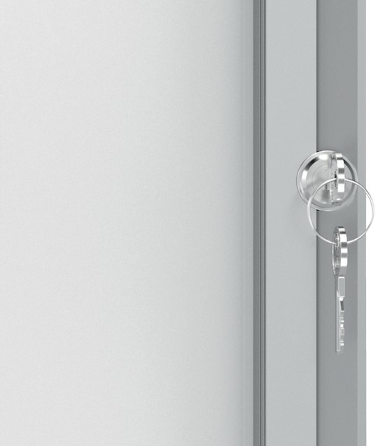 Afsluitbare binnenvitrine met scharnierende deur van veiligheidsglas en slot aan de zijkant.