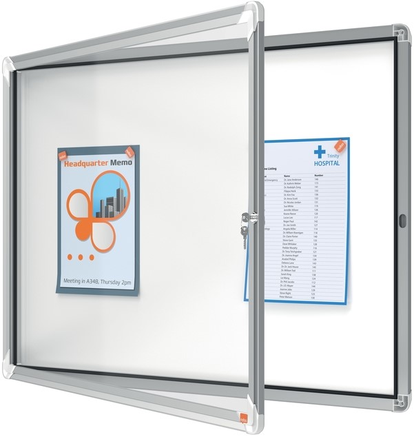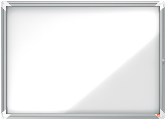 Afsluitbare magnetische binnenvitrine met een scharnierende glazen deur en slot aan de zijkant. Voorzien van een modern stijlvol aluminium frame en hoekbevestiging. Uitstekend magnetisch oppervlak om mededelingen op weer te geven.