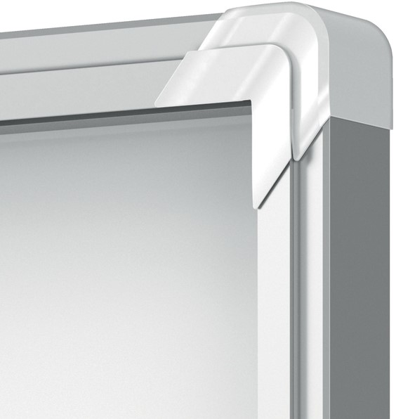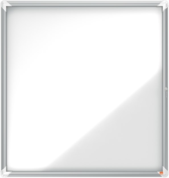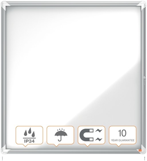 Afsluitbare magnetische weerbestendige buitenvitrine met een scharnierende glazen deur en slot aan de zijkant. Voorzien van een modern stijlvol aluminium frame en hoekbevestiging. Uitstekend magnetisch oppervlak om mededelingen op weer te geven.