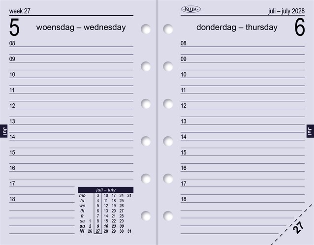 De pagina-indeling is ontworpen om één week per twee pagina's weer te geven, met tijdsleuven van 09.00-17.00 uur.