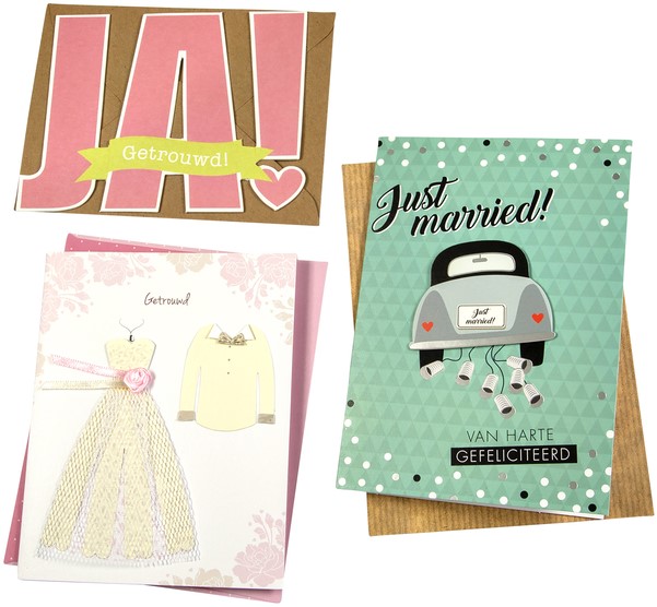 Wenskaart om het gelukkige bruidspaar te feliciteren met hun huwelijk.