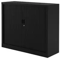 De roldeurkast bestaat uit een stalen frame met kunststof roldeuren.