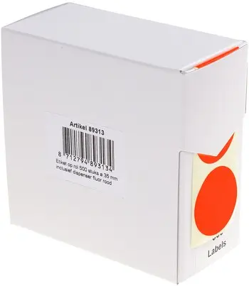 Fluor rode ronde etiketten in kartonnen dispenser.