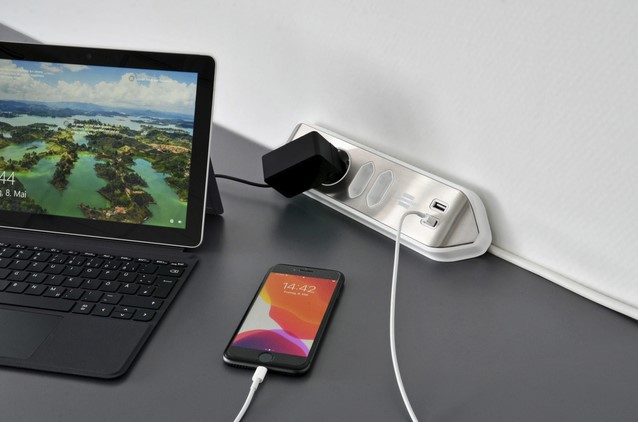De universeel bruikbare contactdoosstrook kan eenvoudig worden bevestigd als Stekkerdoos voor uw werkblad of als tafelcontactdoosstrook voor uw werkplek met behulp van speciale zelfklevende pads.