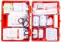 2 Steriele verbanddoek minstens 50x50 cm, 1 Assortiment pleisterstrips à 20 stuks 5, Niet verklevende (alu) kompressen 10x10 cm steriel, 2 Ideaalzwachtel 400x6 cm, 2 Snelverband gerold klein 6x8 cm steriel, 2 Ideaalzwachtel 400x8 cm, 2 Snelverband gerold groot 10x12 cm steriel, 1 Hechtpleister textiel breed 500x2,5 cm, 4 Kompressen 10x10 cm steriel, 1 Elastisch vingerverband à 5 stuks, 4 Kompressen 1/16 steriel, 1 Verbandschaar 19 cm, 1 Beademingsmasker, 1 Reddingsdeken 210x160 cm, 1 Desinfectant 30 ml, 1 Pincet 9 cm, 1 Elastisch hydrofiel zwachtel 400x6 cm, 1 Elastisch hydrofiel zwachtel 400x8 cm, 2 Zelfklevend zwachtel 8 cm, 2 Paar wegwerphandschoenen maat L, 1 Wondpleister textiel 100x6 cm, 1 Stappenplan eerste hulp, 5 Bloedlancet, 2 Hechtstrips à 6 stuks, 2 Eilandpleister 6x8 cm, 1 Gecomprimeerd gaas.