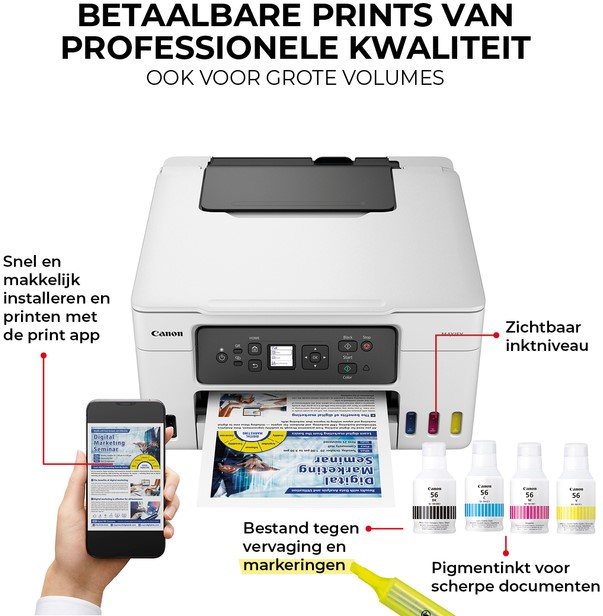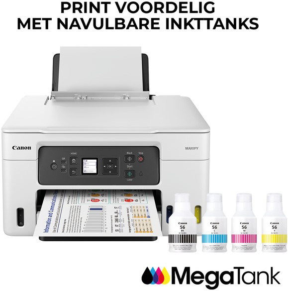 Canon MAXIFY GX3050 – Slim printen voor kleine bedrijven De GX3050 is ontworpen voor hybride werkers en kleine ondernemingen. Print tot 21.000 pagina’s per inktset en bespaar aanzienlijk op kosten per pagina.