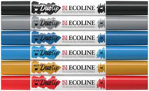 De op kleurstof gebaseerde Duotips werken perfect in combinatie met de Ecoline Brush Pens en Ecoline flacons en bieden je een breed scala aan opties in lijndiktes, stijlen en kleurvariaties.