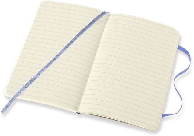 Kenmerken: afgeronde hoeken, elastische sluiting, ivoorkleurig Moleskine-papier, bijpassend leeslint, papier: 70 gsm, zuurvrij, “In geval van verlies”-label op het schutblad, uitbreidbaar binnenvak op achterkaft.