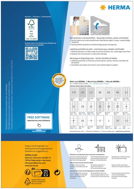 Zelfklevende etiketten op A4-vellen, etiketformaat 63,5x29,6mm wit verwijderbaar, 100 vel per verpakking. Stevig hechtend op alle gladde, droge, onbeschadigde en stofvrije oppervlakken. Te verwijderen zonder resten achter te laten en zonder de ondergrond te beschadigen. Ideaal voor het tijdelijk of wisselend labelen en voor oppervlakken die niet mogen worden beschadigd. Zeer goede drukresultaten op alle laser- en inkjetprinters, kopieerapparaten, kleurenlaserprinters en kleurenkopieerapparaten. Storingvrije verwerking dankzij veiligheidsrand rondom en optimale vlakligging. Milieuvriendelijk: FSC® Mix Credit-gecertificeerd, chloorvrij gebleekt, oplosmiddelvrije contactlijm. Etiketten zijn 100 % recyclebaar via het oud papier, verpakking van gerecycled karton. Gratis softwareoplossingen: www.herma.com/software.