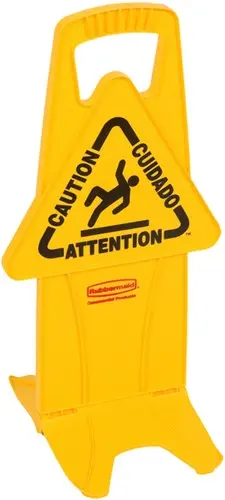 Tweezijdig Rubbermaid waarschuwingsbord met tekst in het Engels, Frans en Spaans.