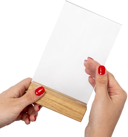 Breng jouw menu’s, aanbiedingen of aankondigingen optimaal onder de aandacht met de IEZZY menukaarthouder T tafeldisplay A4. Deze elegante standaard combineert een kristalheldere plastic houder met een stevige eikenhouten voet, wat zorgt voor een hoogwaardige en natuurlijke uitstraling op elke tafel of balie. Dankzij de handige zijdelingse opening wissel je documenten in een handomdraai, perfect voor drukke horecaomgevingen of ontvangstruimtes. Het royale A4-formaat biedt maximale zichtbaarheid en is ideaal voor het presenteren van uitgebreide informatie. Deze menukaarthouder staat garant voor duurzaamheid, stijl en praktisch gebruiksgemak in één. Kenmerken: