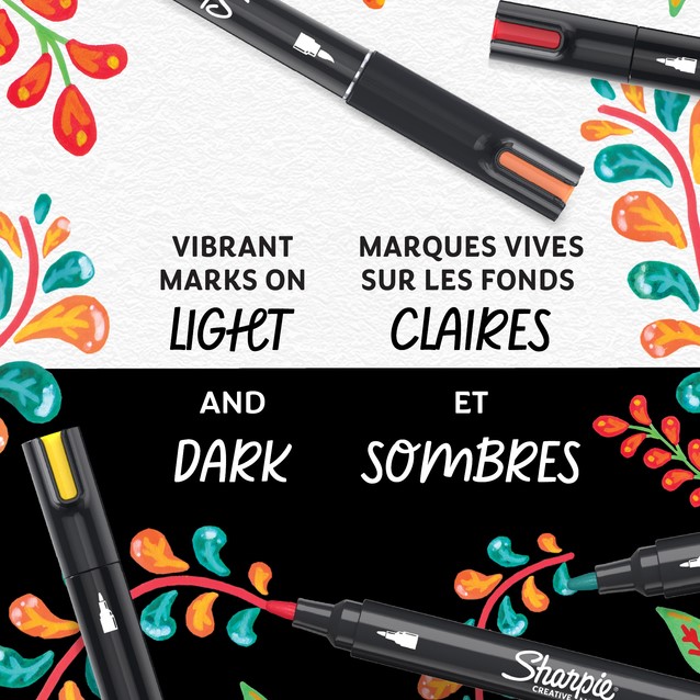 Breng uw artistieke visie tot leven met de Sharpie Creative Markers! Deze acrylmarkers zijn gevuld met een prachtige verfachtige inkt die moeiteloos over de pagina glijdt, maar de controle van een marker biedt. De inkt op waterbasis loopt niet door het papier, zodat uw lijnen strak blijven. Met de felle kleuren maakt u levendige creaties op lichte en donkere oppervlakken op papier, metaal, hout, keramiek, glas, steen en canvas. De kleuren kunnen gemakkelijk in lagen worden aangebracht om meer dimensie aan uw werk te geven. Bovendien hoeft u deze markers met ronde punt niet te schudden; dop eraf en aan de slag!