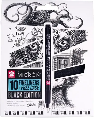 Fineliner Sakura Pigma Micron Black Edition set à 10 breedtes + gratis etui