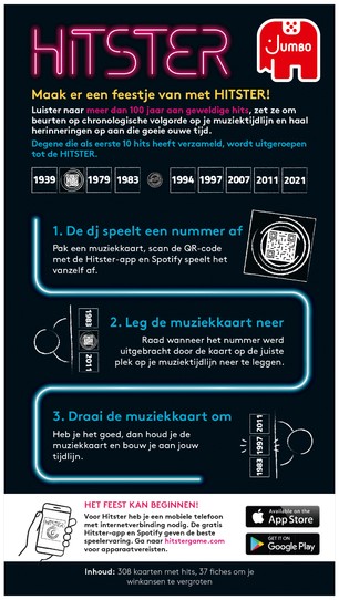 Met meer dan 300 van de grootste hits van de afgelopen 100 jaar is Hitster het perfecte partyspel voor een avond lachen, zingen dansen en het delen van herinneringen. Maak de doos open, scan een muziekkaart en laat de muziek de rest doen om er een feestje van te maken! Dus waar wacht je nog op? Nodig je vrienden uit voor een avondje plezier en ontdek wie uitgeroepen wordt tot Hitster! Hitster is het partyspel waarbij je geen muziekexpert hoeft te zijn. Je kans om te winnen wordt wel groter als je ook de artiesten en titels van het nummer kunt noemen.