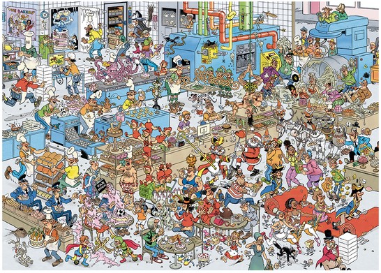 Brood, gebak en koekjes, allemaal specialiteiten van Jan van Haasteren's Bakkerij. Octo is een ware productiekampioen, en Jan heeft een wel heel slimme manier gevonden om spookkoekjes te maken. Terwijl Sinterklaas en de Kerstman niet op hun beurt kunnen wachten. Deze specialiteiten moeten wel buitengewoon lekker zijn! Een Jan van Haasteren puzzel is meer dan een gewone legpuzzel: het is een avonturenserie, met vertrouwde hoofdrolspelers in een eindeloos decor vol absurde details. Ontdek alle doldwaze avonturen van de Jan van Haasteren-familie! Alle puzzels zijn gemaakt van 100% gerecycled karton en duurzaam geproduceerd papier. Specificaties; Geschikt voor puzzelaars vanaf 12 jaar Aantal stukjes: 2.000 Materiaal: karton