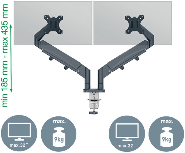Dubbele armen: veerondersteunde hoogteaanpassing (185mm-435mm).