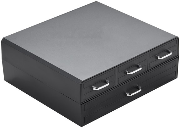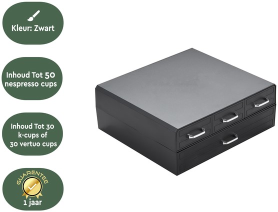 Altijd zoeken naar een koffiecup? De hele la vol maar alle smaken en soorten door elkaar? De BRASQ Koffiecapsulehouder met 4 lades zorgt ervoor dat al je cups en accessoires netjes georganiseerd voor het pakken liggen. Maar ook alle overige koffie- en thee benodigdheden, zoals suiker- en roerstaafjes en melk, heb je alles overzichtelijk bij de hand. De praktische koffiecuphouder past perfect in de koffiecorner van een autogarage, een badkamershowroom of op kantoor. Maar zeker ook in de keuken van je eigen woning kun je de houder eenvoudig onder of naast je koffiemachine plaatsen. De capsulehouder heeft 4 lades, waarvan de grote onderste is uitgerust met handige vakverdeling voor koffie- en thee accessoires. Samen bieden ze plaats aan 50 cups Nespresso of 30 K-cup of Vertuo cups. Dankzij de vorm kun je de cuphouder perfect onder je koffiezetapparaat bewaren, zodat je ruimte in de keuken bespaart. Deze houder zorgt ervoor dat je voortaan alle koffiecups op een vaste plek hebt liggen. Het zorgt voor ruimte, orde en is een niet te missen item in de koffiehoek. Deze praktische opberger is gemaakt van hoogwaardig kunststof (HIPS) en zijn lades zijn uitschuifbaar. De onderkant is voorzien van een antislip kussentjes waardoor hij netjes op zijn plaats blijft staan en krassen op bijvoorbeeld het keukenblad voorkomt. Stijlvol, ruimtebesparend, praktisch en altijd cups bij de hand. Let op: de cups in de afbeelding worden niet meegeleverd.