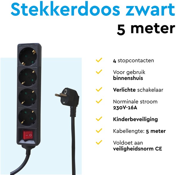 Met zijn handige aan-uit schakelaar kun je gemakkelijk de toevoer van elektriciteit regelen, waardoor je zelf ook het energieverbruik in huis of kantoor bepaald. De schakelaar is uitgerust met verlichting, zodat je ook in het donker duidelijk kunt zien of de schakelaar is ingeschakeld of niet. De verdeeldoos heeft een kabellengte van 5 meter en een zwarte kunststof behuizing. Door de handige schuine plaatsing van de stopcontacten kunnen er makkelijker haakse stekkers op worden aangesloten.