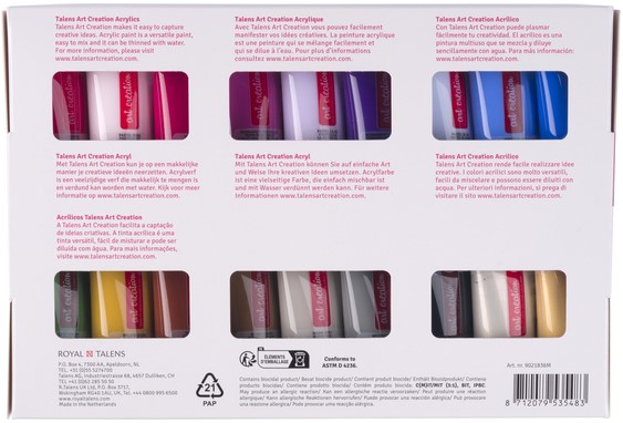 Talens Art Creation acrylverf is een betrouwbare acrylverf op basis van acrylaathars. De verf is pasteus, droogt snel en heeft een zijdeglans. Deze acrylverf is direct uit de tube of verdund met water te gebruiken en droogt watervast op. De kleuren zijn gemakkelijk met elkaar te vermengen en handig in gebruik door de doseerdop.