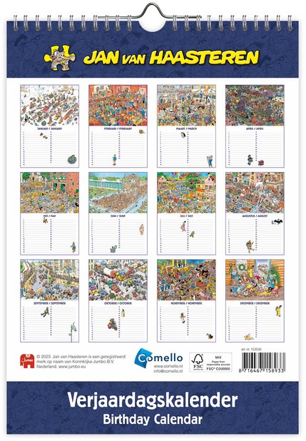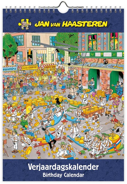 Vergeet nooit meer een verjaardag met de verjaardagskalender van de bekende striptekenaar Jan van Haasteren. 12 Humoristische en kleurrijke platen maken deze verjaardagskalender een uniek product. Deze kalender heeft een afmeting van 21 x 30 cm. Leuk om te weten: Op 26 april 2013 werd Jan van Haasteren benoemd tot Ridder in de Orde van Oranje-Nassau. Jan van Haasteren is vooral ook bekend van de puzzels.