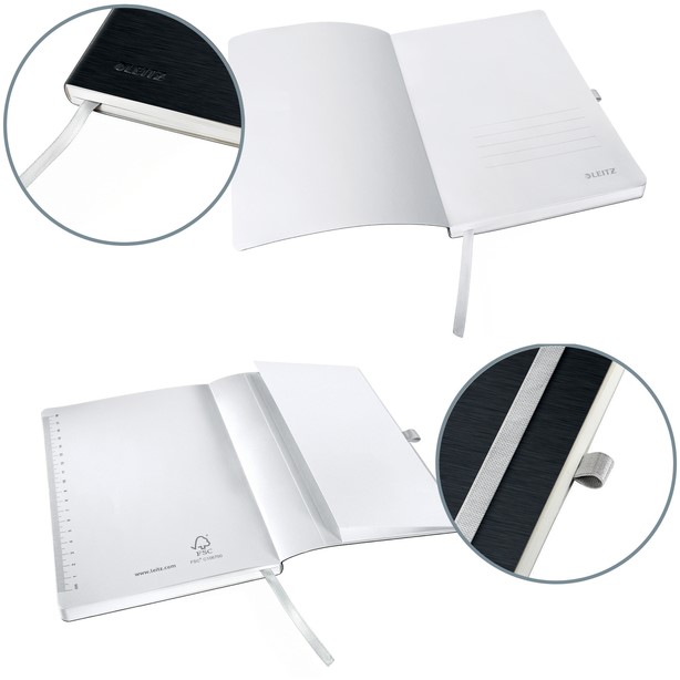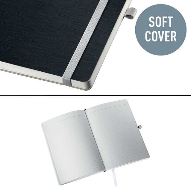 Klassiek notitieboek van hoge kwaliteit met eersteklas omslag in moderne, zacht geborstelde afwerking en elegante kleur. Pennenhouder, elastieksluiting en een binnenvak op de achterkant maken de notitieboekjes nog functioneler. Aantrekkelijke zilverkleurige elastische band houdt de pagina's stevig vast Pennenhouder houdt een pen of potlood altijd bij de hand Textiele paginamarkering helpt bij het snel vinden en openen van een belangrijke pagina Laatste 8 pagina's zijn geperforeerd in kleinere kaarten voor het eenvoudig delen van contactgegevens of korte notities Geïntegreerd uitklapbaar vak aan de binnenkant van de achteromslag voor snelle toegang tot losse papieren en kleine voorwerpen 160 pagina's / 80 vellen hoogwaardig, FSC®-gecertificeerd ivoorkleurig papier van 100 g/m Volledig product is FSC Mix gecertificeerd