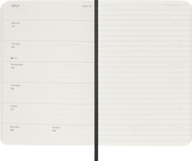 De Moleskine 18 Maanden Weekly Notebook Planner loopt van juli tot december. Deze populaire planner is ingedeeld om de afspraken van de week aan de linkerkant weer te geven en heeft een gelinieerde pagina voor notities en ideeën aan de rechterkant. Hierdoor is het notebook perfect voor studenten, docenten en professionals. De planner heeft een harde of zachte kaft met afgeronde hoeken en een elastische sluiting. - Zachte kaft - Afgeronde hoeken - Elastische sluiting - Moleskine ivoorkleurig papier - Papiergewicht: 70 g/m² - Handige tools: planning, tijdzones, internationale metingen, toegangscodes en vluchtduur - Wereldwijde feestdagenkalender verkrijgbaar via moleskine.com/diaryaddons - Uitbreidbaar binnenvak passend bij de kleur van het notebook - "In geval van verlies" label gedrukt op het schutblad - Bijpassende bladwijzer voor lint - Herbruikbare paperband B-SIDE met extra gedrukte tools - 180° liggende opening - Moleskine srl. creëert en verkoopt FSC-gecertificeerde producten