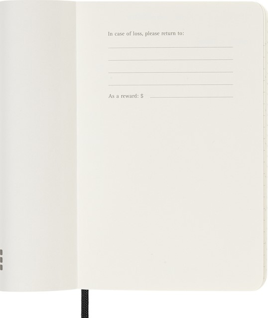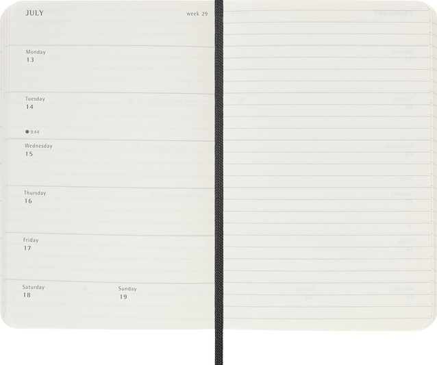De Moleskine Weekly Notebook Planner is gedateerd van januari tot december. Het is een handige en veelzijdige planner die de vrijheid van een notitieboekje bevat en is ingedeeld met de afspraken van de week aan de linkerkant en een gelinieerde pagina voor notities op de rechter bladzijde. Het notitieboekje is beschikbaar met een harde of een zachte kaft met afgeronde hoeken en een elastische sluiting. - Zachte kaft - Afgeronde hoeken - Elastische sluiting - Moleskine ivoorkleurig papier - Papiergewicht: 70 g/m² - Handige tools: planning, tijdzones, internationale metingen, toegangscodes en vluchtduur - Uitbreidbaar binnenvak passend bij de kleur van het notebook - "In geval van verlies" label gedrukt op het schutblad - Bijpassende bladwijzer voor lint - Herbruikbare paperband B-SIDE met extra gedrukte tools - 180° liggende opening - Moleskine srl. creëert en verkoopt FSC-gecertificeerde producten