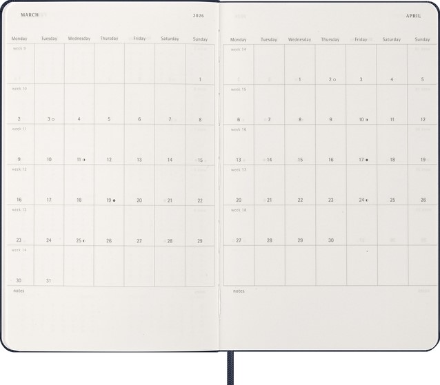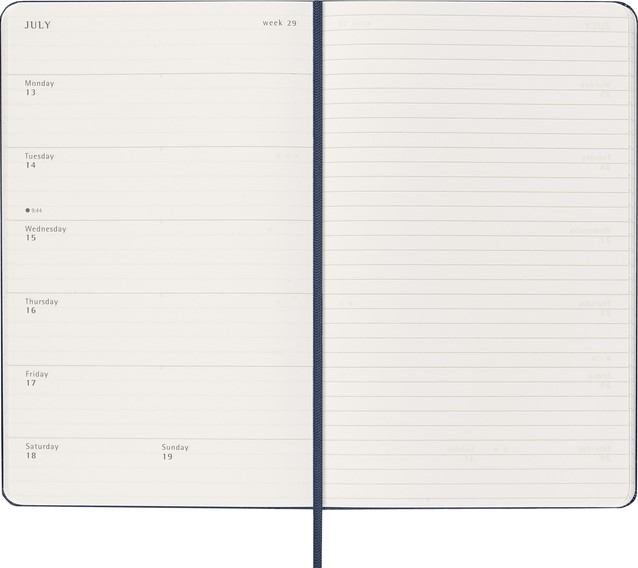 De Moleskine Weekly Notebook Planner is gedateerd van januari tot december. Het is een handige en veelzijdige planner die de vrijheid van een notitieboekje bevat en is ingedeeld met de afspraken van de week aan de linkerkant en een gelinieerde pagina voor notities op de rechter bladzijde. Het notitieboekje is beschikbaar met een harde of een zachte kaft met afgeronde hoeken en een elastische sluiting. - Harde kaft - Afgeronde hoeken - Elastische sluiting - Moleskine ivoorkleurig papier - Papiergewicht: 70 g/m² - Handige tools: planning, tijdzones, internationale metingen, toegangscodes en vluchtduur - Uitbreidbaar binnenvak passend bij de kleur van het notebook - "In geval van verlies" label gedrukt op het schutblad - Bijpassende bladwijzer voor lint - Herbruikbare paperband B-SIDE met extra gedrukte tools - 180° liggende opening - Moleskine srl. creëert en verkoopt FSC-gecertificeerde producten