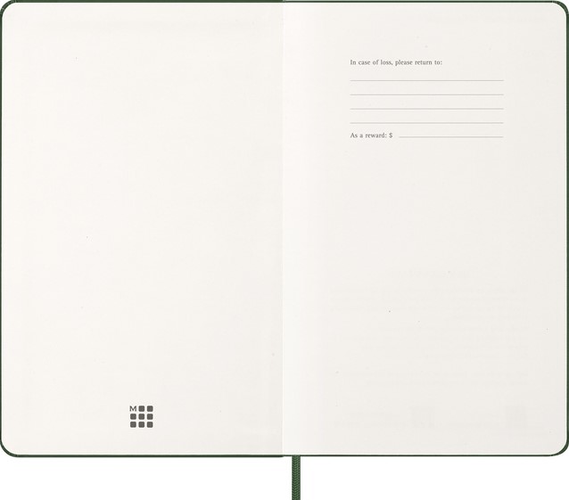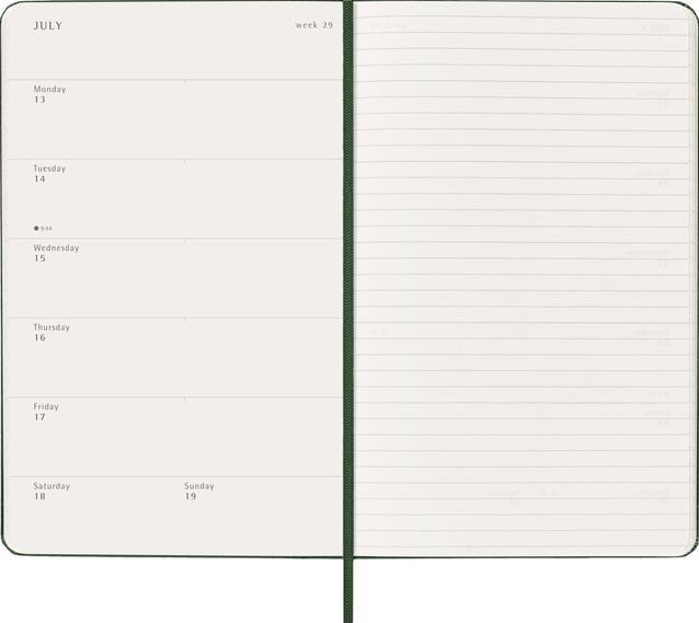 De Moleskine Weekly Notebook Planner is gedateerd van januari tot december. Het is een handige en veelzijdige planner die de vrijheid van een notitieboekje bevat en is ingedeeld met de afspraken van de week aan de linkerkant en een gelinieerde pagina voor notities op de rechter bladzijde. Het notitieboekje is beschikbaar met een harde of een zachte kaft met afgeronde hoeken en een elastische sluiting. - Harde kaft - Afgeronde hoeken - Elastische sluiting - Moleskine ivoorkleurig papier - Papiergewicht: 70 g/m² - Handige tools: planning, tijdzones, internationale metingen, toegangscodes en vluchtduur - Uitbreidbaar binnenvak passend bij de kleur van het notebook - "In geval van verlies" label gedrukt op het schutblad - Bijpassende bladwijzer voor lint - Herbruikbare paperband B-SIDE met extra gedrukte tools - 180° liggende opening - Moleskine srl. creëert en verkoopt FSC-gecertificeerde producten