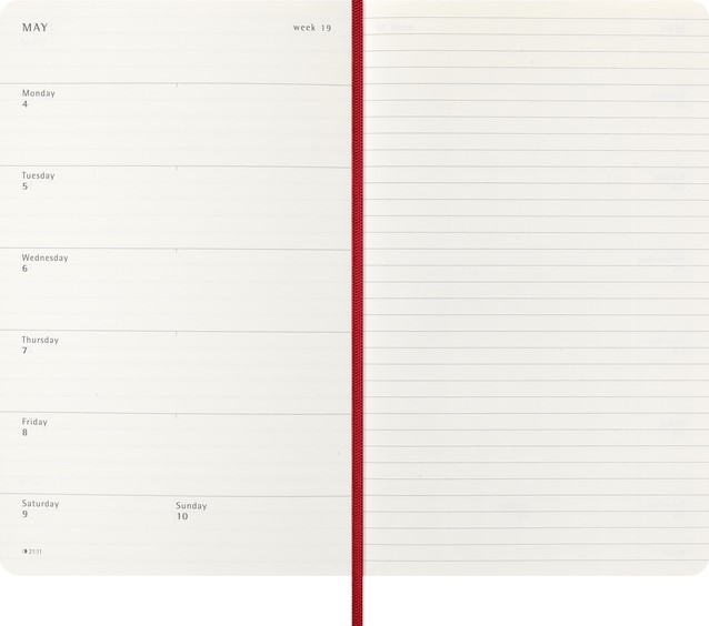 De Moleskine Weekly Notebook Planner is gedateerd van januari tot december. Het is een handige en veelzijdige planner die de vrijheid van een notitieboekje bevat en is ingedeeld met de afspraken van de week aan de linkerkant en een gelinieerde pagina voor notities op de rechter bladzijde. Het notitieboekje is beschikbaar met een harde of een zachte kaft met afgeronde hoeken en een elastische sluiting. - Zachte kaft - Afgeronde hoeken - Elastische sluiting - Moleskine ivoorkleurig papier - Papiergewicht: 70 g/m² - Handige tools: planning, tijdzones, internationale metingen, toegangscodes en vluchtduur - Uitbreidbaar binnenvak passend bij de kleur van het notebook - "In geval van verlies" label gedrukt op het schutblad - Bijpassende bladwijzer voor lint - Herbruikbare paperband B-SIDE met extra gedrukte tools - 180° liggende opening - Moleskine srl. creëert en verkoopt FSC-gecertificeerde producten