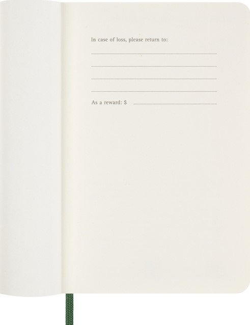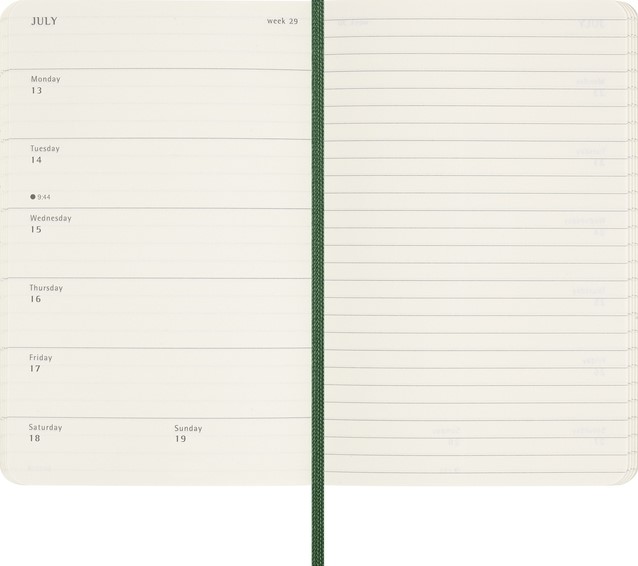 De Moleskine Weekly Notebook Planner is gedateerd van januari tot december. Het is een handige en veelzijdige planner die de vrijheid van een notitieboekje bevat en is ingedeeld met de afspraken van de week aan de linkerkant en een gelinieerde pagina voor notities op de rechter bladzijde. Het notitieboekje is beschikbaar met een harde of een zachte kaft met afgeronde hoeken en een elastische sluiting. - Zachte kaft - Afgeronde hoeken - Elastische sluiting - Moleskine ivoorkleurig papier - Papiergewicht: 70 g/m² - Handige tools: planning, tijdzones, internationale metingen, toegangscodes en vluchtduur - Uitbreidbaar binnenvak passend bij de kleur van het notebook - "In geval van verlies" label gedrukt op het schutblad - Bijpassende bladwijzer voor lint - Herbruikbare paperband B-SIDE met extra gedrukte tools - 180° liggende opening - Moleskine srl. creëert en verkoopt FSC-gecertificeerde producten