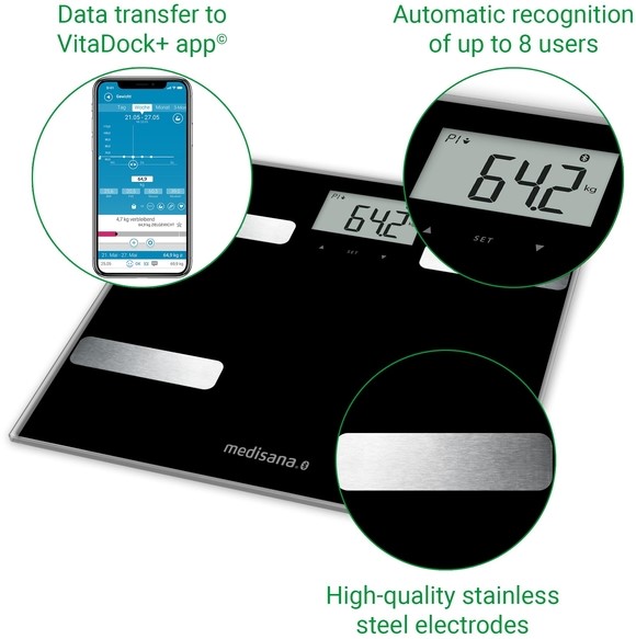 De medisana BS A41 connect lichaamssamenstellingsmonitor is uitgerust met hoogwaardige roestvrijstalen elektroden. Hij beschikt over 30 geheugenplaatsen per gebruiker voor hersynchronisatie. Zoals bij alle medisana connect producten kunt u uw vitale gegevens dankzij de moderne Bluetooth gegevensoverdracht gemakkelijk overzetten naar de VitaDock+ app (iOS & Android) en VitaDock-Online en gebruiken voor verdere analysefuncties.