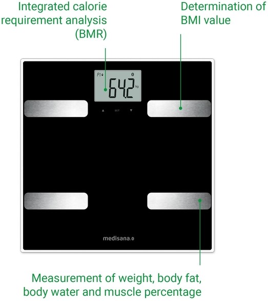 Naast gewichts- en lichaamsgegevens bepaalt de medisana BS A41 connect body composition monitor ook de body mass index, de zogenaamde BMI-waarde. De geïntegreerde analyse van de caloriebehoefte - ook wel BMR-functie genoemd - rondt de uitgebreide functies af. De automatische herkenning van maximaal acht gebruikers op de BS A41 connect body composition monitor betekent ook dat veel mensen die in hetzelfde huishouden wonen hun vitale gegevens kunnen bepalen en analyseren.