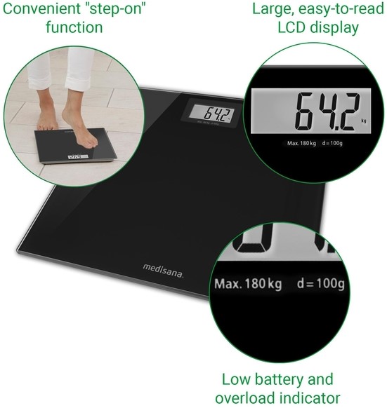 De glazen personenweegschaal PS 400 van medisana, een van de toonaangevende specialisten op de thuiszorgmarkt, is een betrouwbare partner voor dagelijkse gewichtscontrole. Dankzij het bijzonder platte design is de medisana PS 400 glazen weegschaal een moderne blikvanger voor elke badkamer.