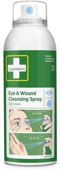 Spray om stof en vuil uit de ogen en wonden weg te spoelen en deze te reinigen. De spray geeft een milde stroom water, met een totale spoeltijd van 5 minuten. De spray werkt in elke hoek en in iedere richting. De spray kan verscheidene keren worden gebruikt en blijft tot de allerlaatste druppel steriel. Bevat 150 ml steriele natriumchlorideoplossing, 0,9 % NaCl. Ecovriendelijk drijfgas. Past in het eerstehulpstation. Houdbaarheidsperiode 5 jaar.