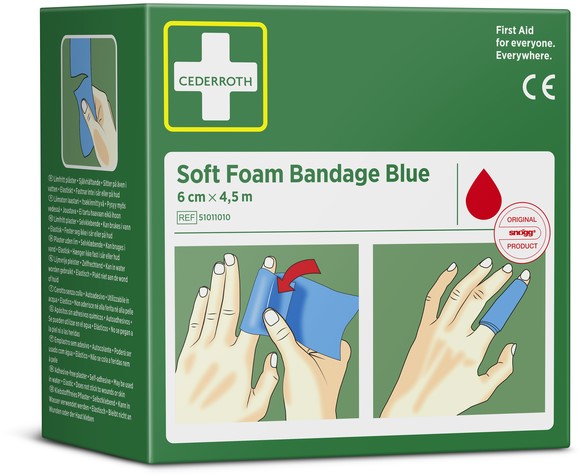 Cederroth Soft Foam Bandage Blue 4,5m fungeert zowel als pleister als verband en is geschikt voor kleinere wonden. Gemakkelijk aan te brengen op vingers, handen, armen, tenen, voeten en benen enzovoort. Het verband is geschikt voor alle typen kleine wonden onafhankelijk van warmte, koude, natheid of droogte en blijft zitten, zelfs in water.